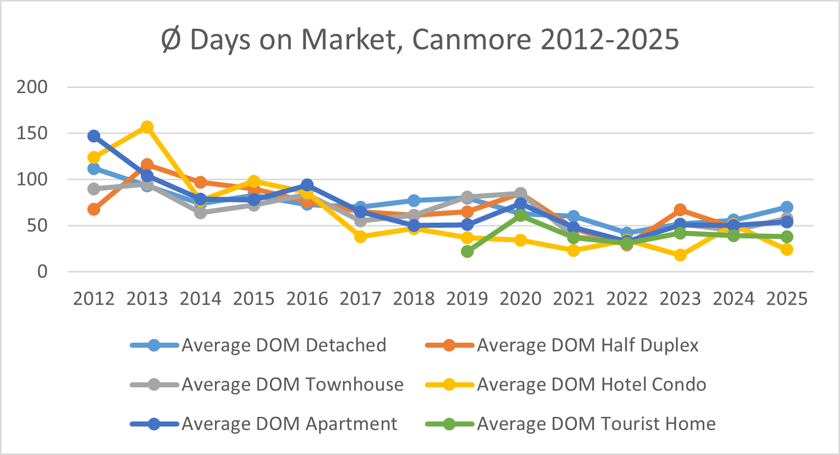 While Days on Market increased slightly across most property types, inventory remained the dominant constraint: Even with longer selling times, buyers still face limited choice.
