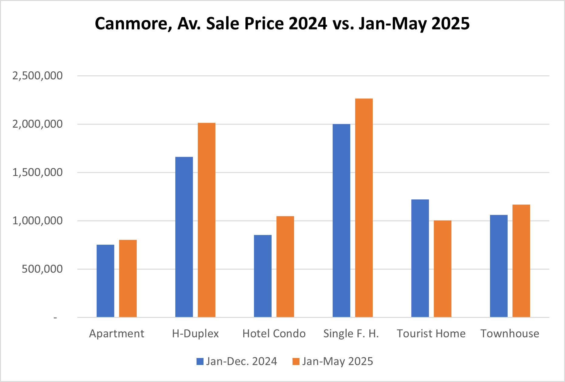 Regardless of the slight drop in sales numbers, prices continued to rise for Canmore this year. Whilst the average sale price in 2024 was below $1.2 Mio, the average sale price of properties sold during the first 5 months this year was over $1.3 Mio. An increase of about 14%.